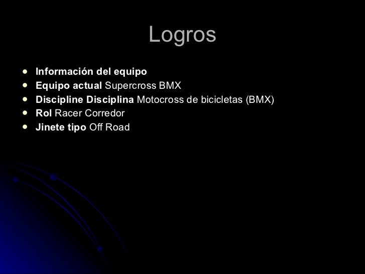 - 10. Logros <ul><li>Información del equipo </li></ul><ul><li>Equipo actual Supercross BMX </li></ul><ul><li>Discipline Disciplina Motocross de bicicletas (BMX) </li></ul><ul><li>Rol Racer Corredor </li></ul><ul><li>Jinete tipo Off Road </li></ul>