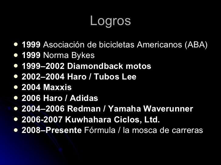 - 12. Logros <ul><li>1999 Asociación de bicicletas Americanos (ABA) </li></ul><ul><li>1999 Norma Bykes </li></ul><ul><li>1999–2002 Diamondback motos </li></ul><ul><li>2002–2004 Haro / Tubos Lee </li></ul><ul><li>2004 Maxxis </li></ul><ul><li>2006 Haro / Adidas </li></ul><ul><li>2004–2006 Redman / Yamaha Waverunner </li></ul><ul><li>2006-2007 Kuwhahara Ciclos, Ltd. </li></ul><ul><li>2008–Presente Fórmula / la mosca de carreras </li></ul>