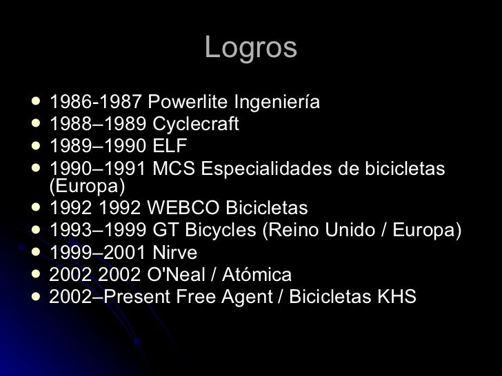 - 14. Logros <ul><li>1986-1987 Powerlite Ingeniería </li></ul><ul><li>1988–1989 Cyclecraft </li></ul><ul><li>1989–1990 ELF </li></ul><ul><li>1990–1991 MCS Especialidades de bicicletas (Europa) </li></ul><ul><li>1992 1992 WEBCO Bicicletas </li></ul><ul><li>1993–1999 GT Bicycles (Reino Unido / Europa) </li></ul><ul><li>1999–2001 Nirve </li></ul><ul><li>2002 2002 O'Neal / Atómica </li></ul><ul><li>2002–Present Free Agent / Bicicletas KHS </li></ul>