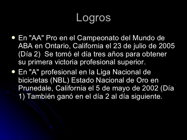 - 16. Logros <ul><li>En "AA" Pro en el Campeonato del Mundo de ABA en Ontario, California el 23 de julio de 2005 (Día 2) Se tomó el día tres años para obtener su primera victoria profesional superior. </li></ul><ul><li>En "A" profesional en la Liga Nacional de bicicletas (NBL) Estado Nacional de Oro en Prunedale, California el 5 de mayo de 2002 (Día 1) También ganó en el día 2 al día siguiente. </li></ul>