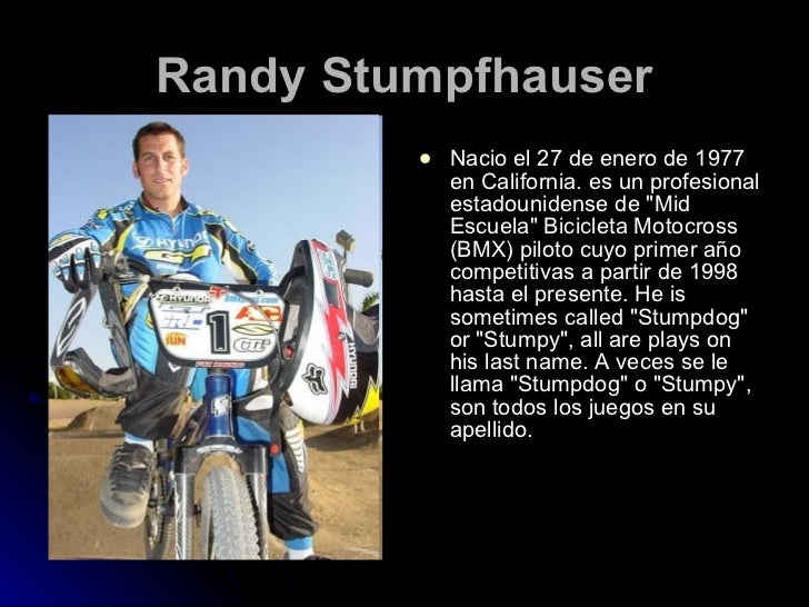 - 17. Randy Stumpfhauser <ul><li>Nacio el 27 de enero de 1977 en California. es un profesional estadounidense de "Mid Escuela" Bicicleta Motocross (BMX) piloto cuyo primer año competitivas a partir de 1998 hasta el presente. He is sometimes called "Stumpdog" or "Stumpy", all are plays on his last name. A veces se le llama "Stumpdog" o "Stumpy", son todos los juegos en su apellido. </li></ul>