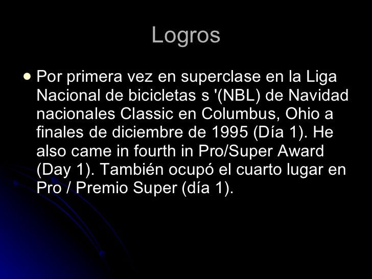 - 18. Logros <ul><li>Por primera vez en superclase en la Liga Nacional de bicicletas s '(NBL) de Navidad nacionales Classic en Columbus, Ohio a finales de diciembre de 1995 (Día 1). He also came in fourth in Pro/Super Award (Day 1). También ocupó el cuarto lugar en Pro / Premio Super (día 1). </li></ul>