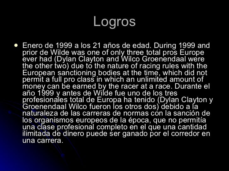 - 20. Logros <ul><li>Enero de 1999 a los 21 años de edad. During 1999 and prior de Wilde was one of only three total pros Europe ever had (Dylan Clayton and Wilco Groenendaal were the other two) due to the nature of racing rules with the European sanctioning bodies at the time, which did not permit a full pro class in which an unlimited amount of money can be earned by the racer at a race. Durante el año 1999 y antes de Wilde fue uno de los tres profesionales total de Europa ha tenido (Dylan Clayton y Groenendaal Wilco fueron los otros dos) debido a la naturaleza de las carreras de normas con la sanción de los organismos europeos de la época, que no permitía una clase profesional completo en el que una cantidad ilimitada de dinero puede ser ganado por el corredor en una carrera. </li></ul>