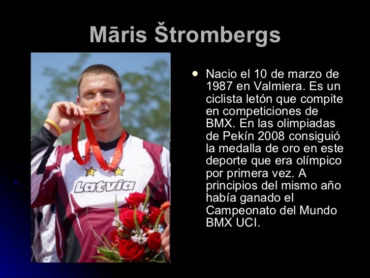 - 3. Māris Štrombergs <ul><li>Nacio el 10 de marzo de 1987 en Valmiera. Es un ciclista letón que compite en competiciones de BMX. En las olimpiadas de Pekín 2008 consiguió la medalla de oro en este deporte que era olímpico por primera vez. A principios del mismo año había ganado el Campeonato del Mundo BMX UCI. </li></ul>