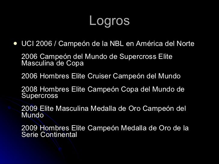 - 6. Logros <ul><li>UCI 2006 / Campeón de la NBL en América del Norte 2006 Campeón del Mundo de Supercross Elite Masculina de Copa 2006 Hombres Elite Cruiser Campeón del Mundo 2008 Hombres Elite Campeón Copa del Mundo de Supercross 2009 Elite Masculina Medalla de Oro Campeón del Mundo 2009 Hombres Elite Campeón Medalla de Oro de la Serie Continental </li></ul>
