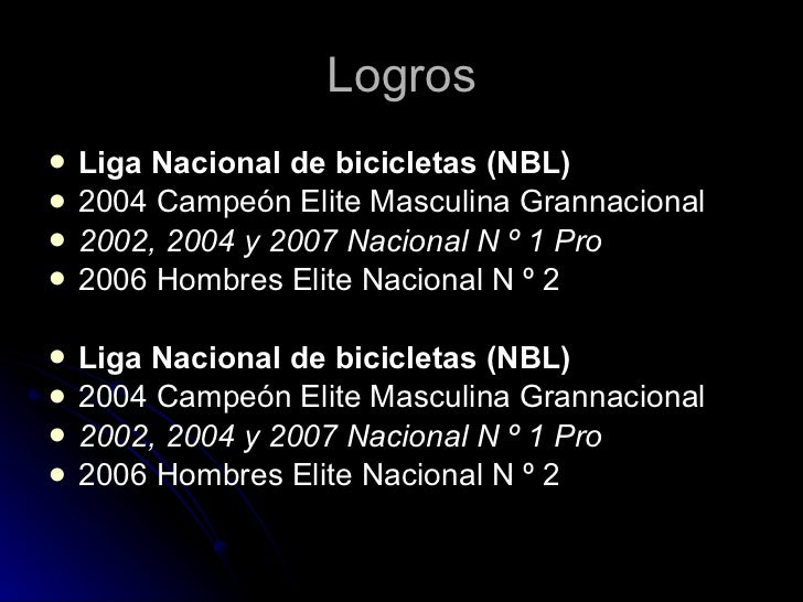 - 8. Logros <ul><li>Liga Nacional de bicicletas (NBL) </li></ul><ul><li>2004 Campeón Elite Masculina Grannacional </li></ul><ul><li>2002, 2004 y 2007 Nacional N º 1 Pro </li></ul><ul><li>2006 Hombres Elite Nacional N º 2 </li></ul><ul><li>Liga Nacional de bicicletas (NBL) </li></ul><ul><li>2004 Campeón Elite Masculina Grannacional </li></ul><ul><li>2002, 2004 y 2007 Nacional N º 1 Pro </li></ul><ul><li>2006 Hombres Elite Nacional N º 2 </li></ul>